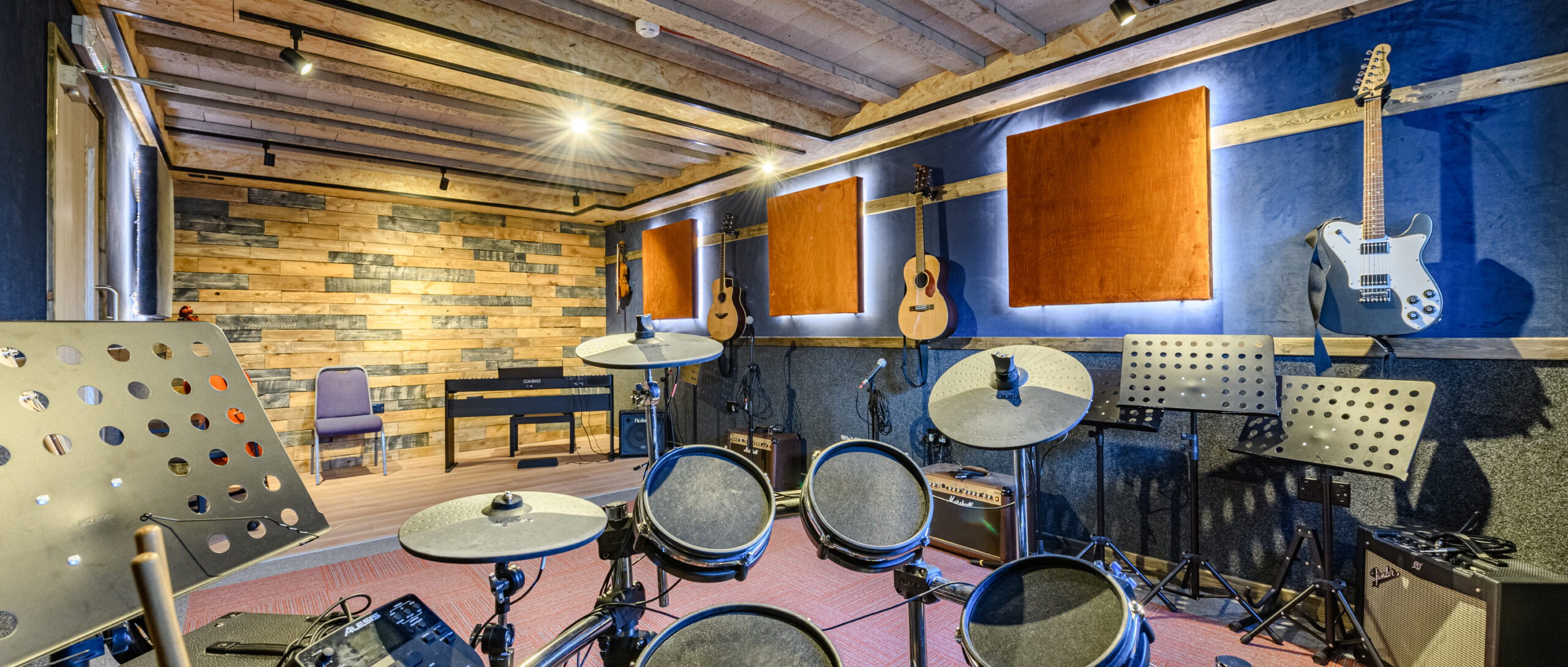 The space includes three separate areas: one for larger band or ensemble practice; a second as creative space for brainstorming, writing, composing and set planning and a smaller room for solo practising or learning instruments.